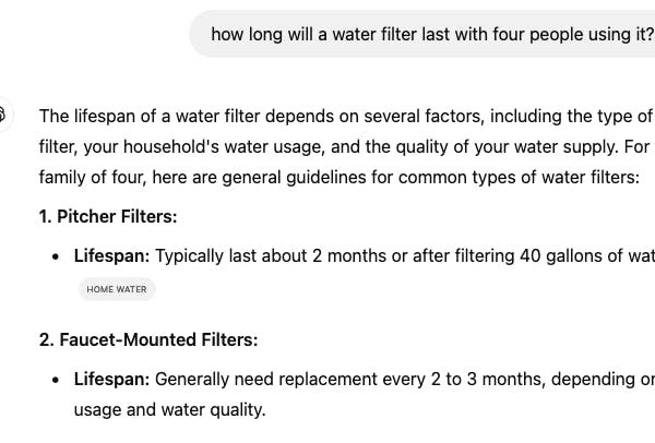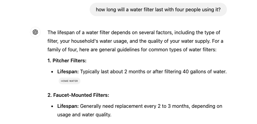 Another idea is to ask SearchGPT how often you’ll need to change your water filter based on your household size: